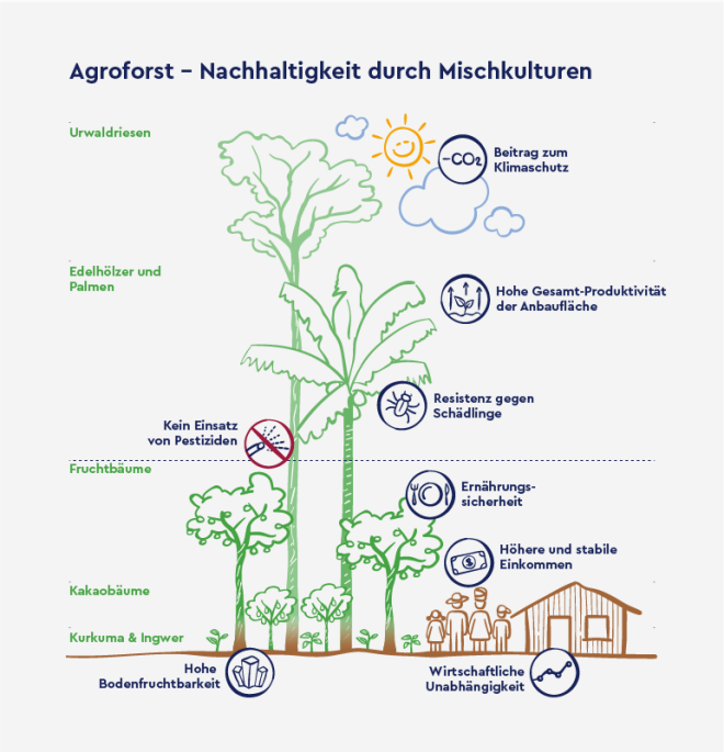Abhilfe schafft die Dynamische Agroforstwirtschaft: DAF ist ein Mischanbau von Kakao, Fruchtbäumen und Edelhölzern, bei welchem die ursprüngliche Regenwaldheimat des Kakaos nachgebildet wird. Kakao wächst in Kombination mit einjährigen Nutzpflanzen wie Mais, Bohnen und Maniok oder mehrjährigen wie Banane, Avocado und Mango sowie mit Edelholzbäumen wie Mahagoni und Zeder. Die verschiedenen Pflanzen können voneinander profitieren: hochwachsende Pflanzen spenden Schatten, so gedeiht Kakao im schattigen Unterholz besser; Pflanzen mit hohen Nährstoffansprüchen erhalten Unterstützung von nährstoffspendenden Nachbarpflanzen; organisches Material, das bei dieser Anbaumethode anfällt, wird liegengelassen und als natürlicher Dünger verwendet.