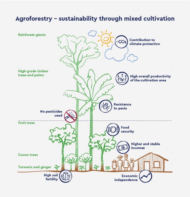 Within the scope of our commitment to sustainability, we want to take our expertise and our resources straight to the source – for example, to the countries where our various raw materials are grown. Dynamic agroforestry or DAF is a particularly promising approach to this endeavour (see Agroforestry Policy).