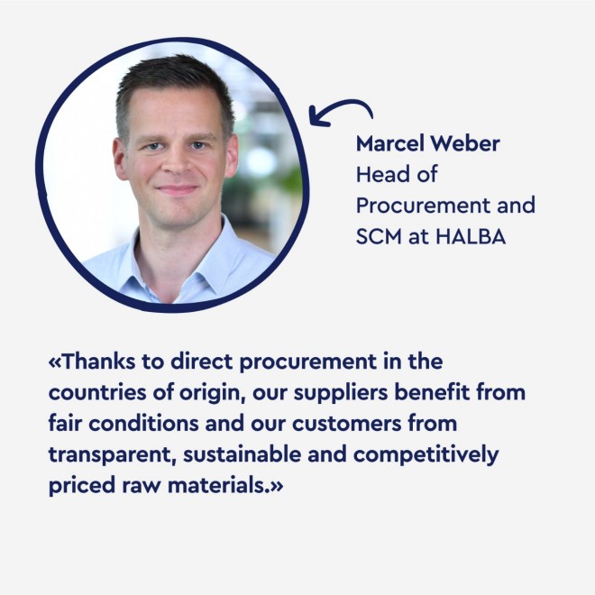 In the procurement of its raw materials along its supply chains, HALBA always ensures fairness towards producers, gentle use of natural resources, efficiency and economic responsibility.