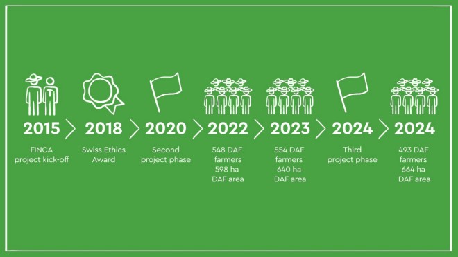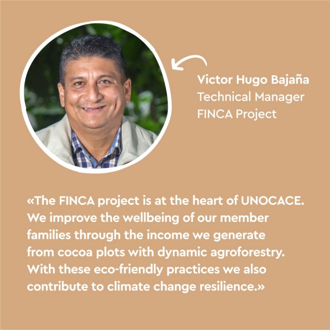 The FINCA project promotes sustainable cocoa cultivation through dynamic agroforestry (DAF) and stores CO2 as a contribution to climate protection, certified until 2024 according to the «Gold Standard», the strictest standard for climate protection projects. Through the cultivation of fruit trees and annual food crops, the project contributes to food security and helps the farmers minimise their risk. The project promotes the development of additional value chains - for example for manioc, limes, cooking bananas and fruit bananas - so that the farmers can sell the additional food they grow alongside their self-sufficiency. Currently, 493 UNOCACE cocoa farmers are tending their plots in DAF conditions. UNOCACE employs 13 agroforestry coaches and one coordinator who have received intensive training within the scope of the project and now educate other local farmers.