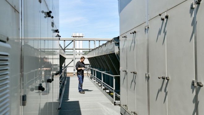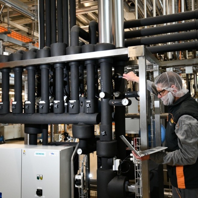 One example of this is the optimisation of cooling systems. These generate cold water for various temperature levels required in production as well as for air conditioning some rooms. In order to achieve energy savings consistently over time, the building technology team continuously analyses data in the building management system and aligns temperature levels with production. We have already been able to achieve a number of improvements in this way. These include raising temperature levels minimally during the production process, for instance increasing the room temperatures of cold-storage rooms, increasing temperatures in service rooms and isolating cold water pipes in the hydraulic unit. In 2024, new studies and preliminary plans were scheduled for the replacement of the cooling system, with the aim of unlocking further energy-saving potential.